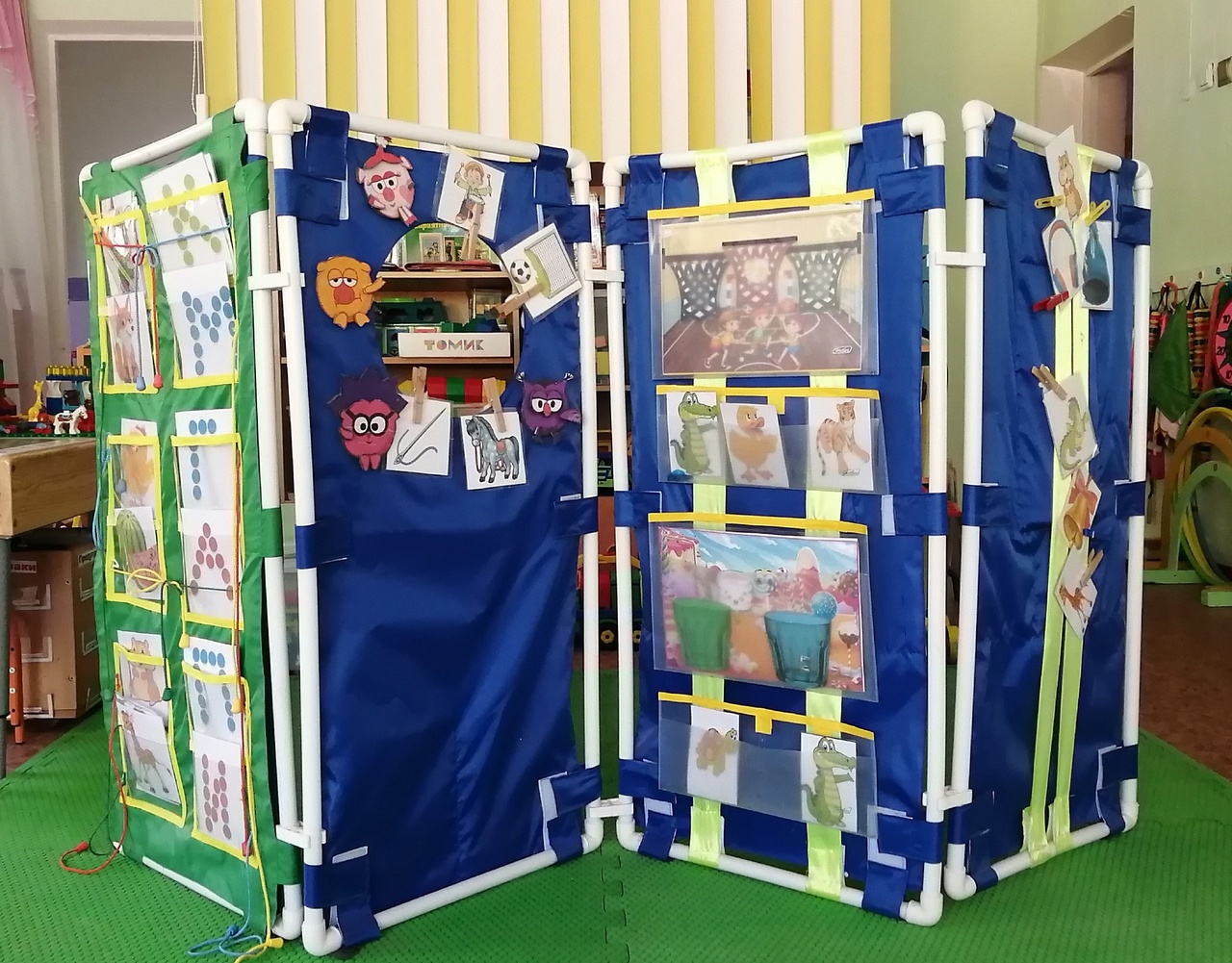 Представляю вашему вниманию многофункциональное пособие по развитию фонематического восприятия и речевых умений . Это «Чудо – ширма», на каждой грани которой представлено задание на развитие того или иного умения ребенка. Немного подробнее о наполняемости данного пособия.